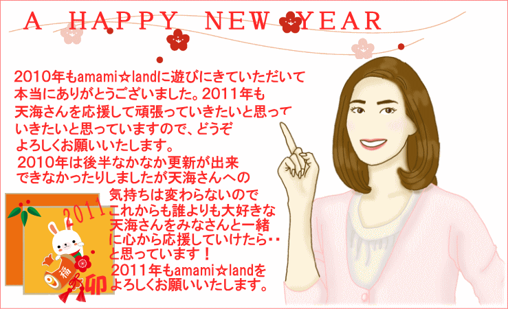 2011年は、2010年後半の更新を怠ってしまった分、もっともっと頑張っていこうと思っていますので、みなさん、これからもどうぞよろしくお願いいたします。天海さんの情報等、ありましたらBBS、管理人宛てへのメールなどでお知らせいただけると嬉しいです。2011年で8年が経つamami☆landでは