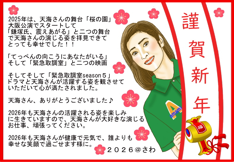 私自身、仕事で忙しくはなっていますが、天海さんを応援する気持ちは仕事には関係無く、これからも変わらない気持ちです!!天海さん、これからもずっと応援しています!!天海さんが幸せな気持ちでお仕事できることをいつも願っています。いつも笑顔で幸せでいてくださいね。2025年もお疲れ様でした、2026年がもっとより良い年になりますように。